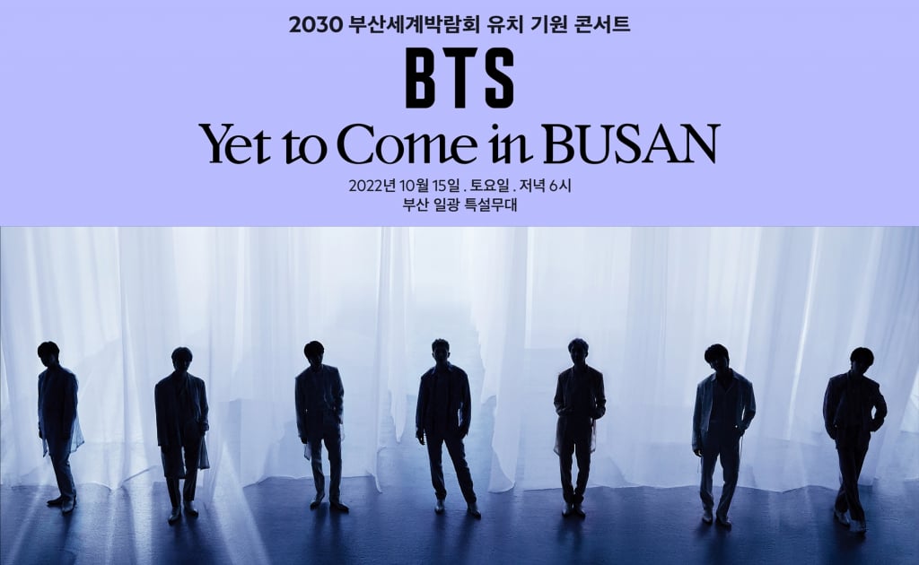 BTS 부산 콘서트 BTS가 이번에 10월 부산 엑스포 세계박람회 유치 기원 콘서트인 Yet To Come을 준비합니다. BTS의 2030 부산세계박람회 유치 기원 콘서트 BTS 옛 투 컴 인 부산 BTS Yet To Come in BUSAN이 오는 15일 오후 6시 한국시간 부산 아시아드 주경기장에서. 부산엑스포 BTS 콘서트 방탄소년단 일정.